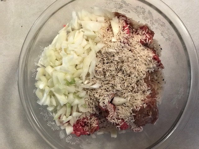 Mix the beef, rice, 1/2 cup of the tomato sauce, the salt, pepper, onion, and garlic.