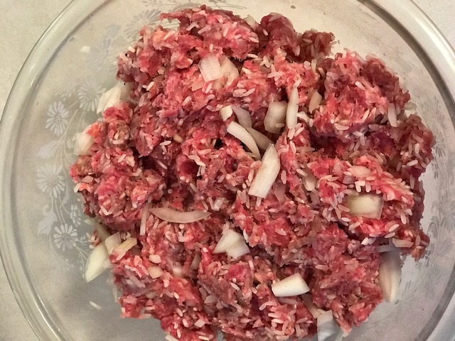 With your cabbage leaves ready, place about 1/3 cup of the beef mixture at the end of each leaf. Now roll the leaf around the beef mixture, tucking in the sides.