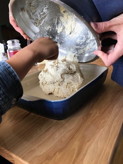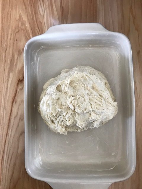 - To make a single large loaf, pick up the mixing bowl, turn it over, and plop the dough into the larger casserole dish. To make two small loaves, use your forks to separate the dough down the center. Then, divide it into two equal pieces. Use the forks to lift each half of the dough into the prepared bowls. If the dough is wet and hard to handle, lightly grease your hands and transfer each half to a bowl.