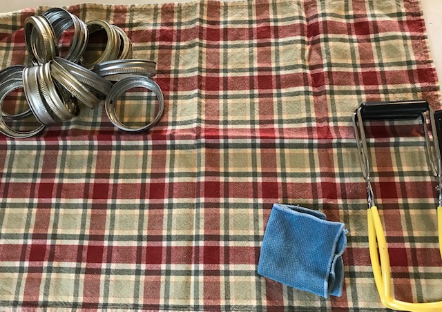 - Have your rings, a small washcloth, your magnet, and your jar clamp on a towel. The towel helps prevent the filled hot jars from sliding on your countertop.