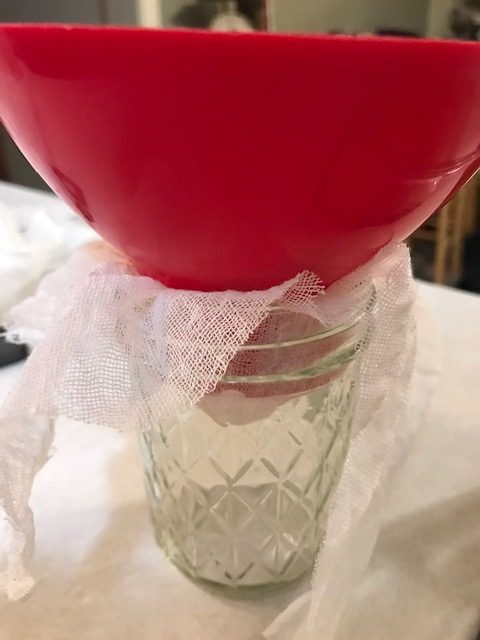 - You will notice the milk solids in the bottom of the cheesecloth after the ghee has been poured through. You can feed these to your animals or discard them.