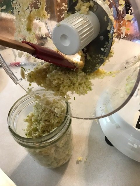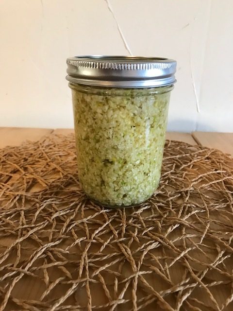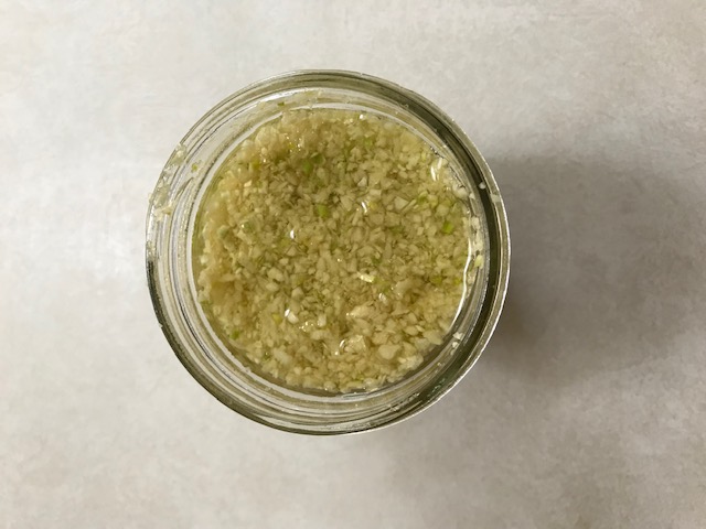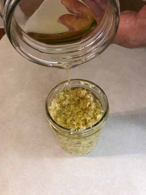 Using a spatula, place your cloves in a clean glass jar and pour your pure olive oil over the minced garlic until it is covered.